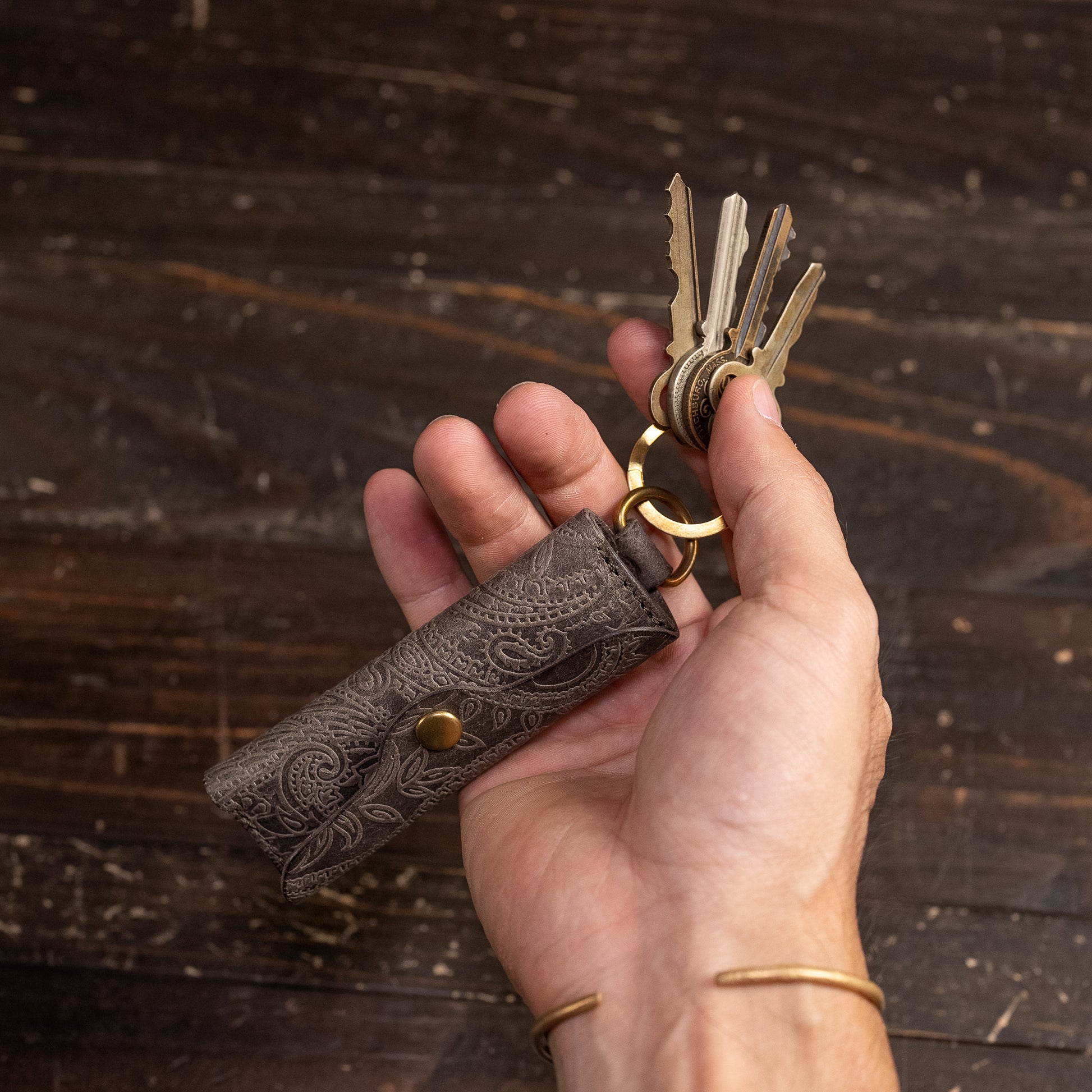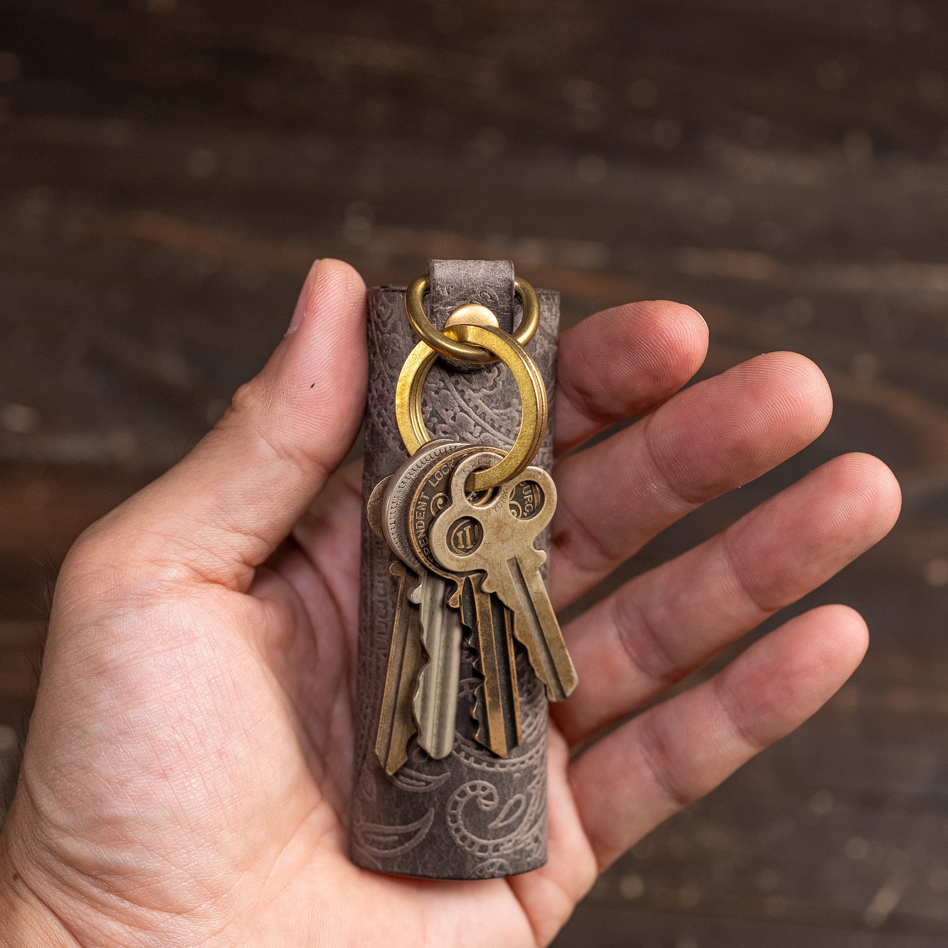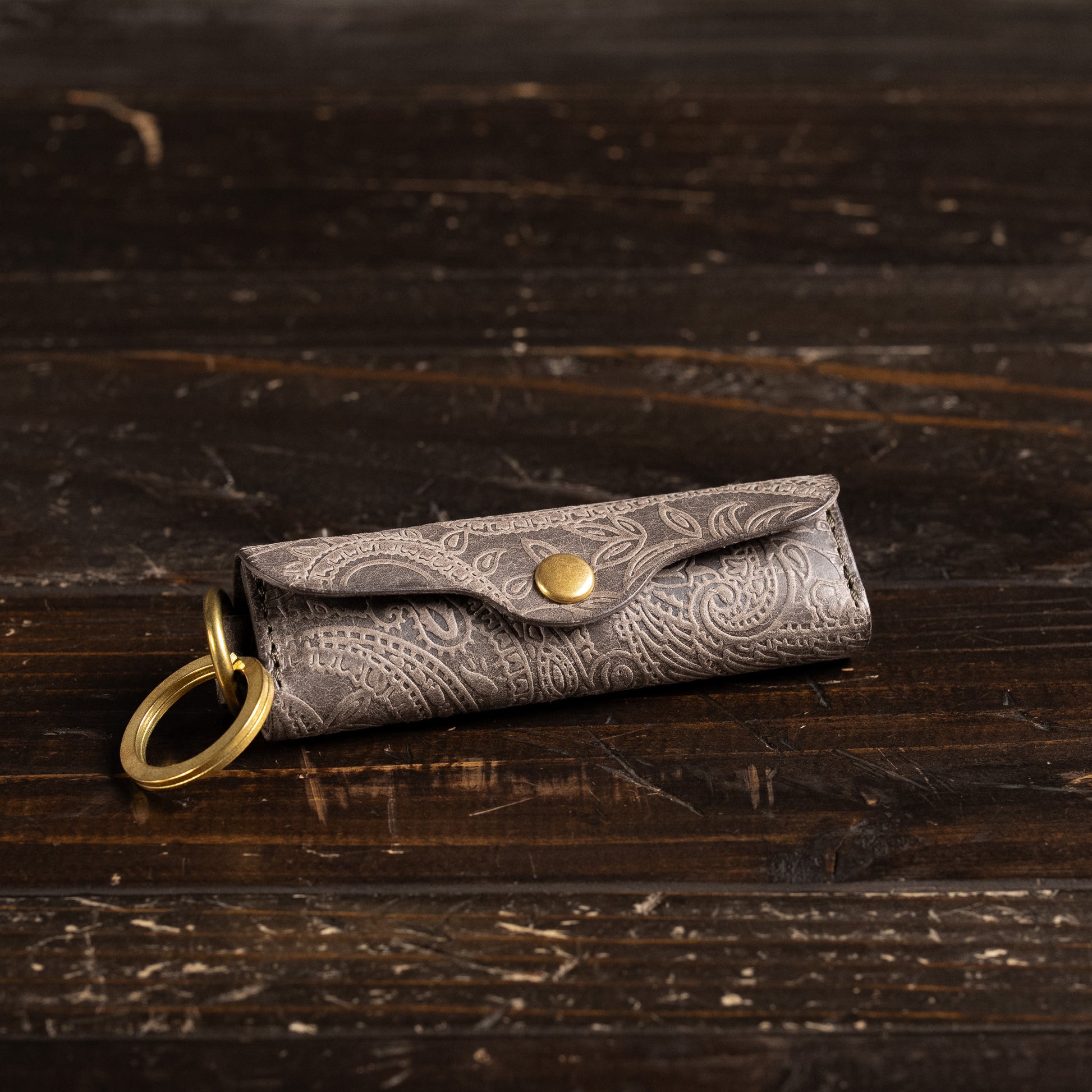 This leather is produced by Virgilio Conceria Artigiana, located in the Ponte a Egola area of Tuscany, Italy. It features a shoulder leather called Margaux, known for its distinctive scratch texture on the surface, which is then embossed with a paisley pattern.