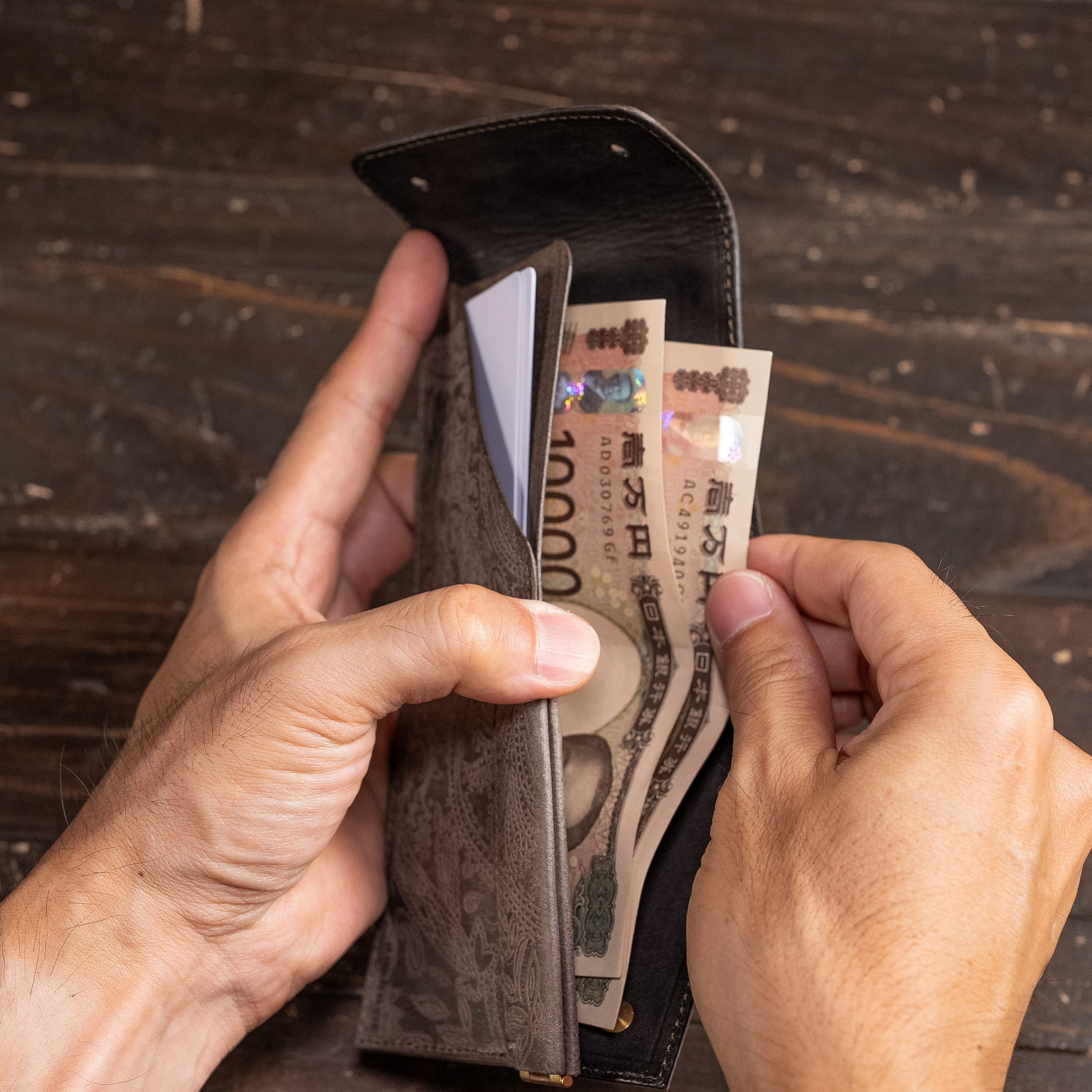 Using a tool called a "branding pen," whose tip is heated to nearly 400°C, cursive letters are written while burning the surface of the leather.