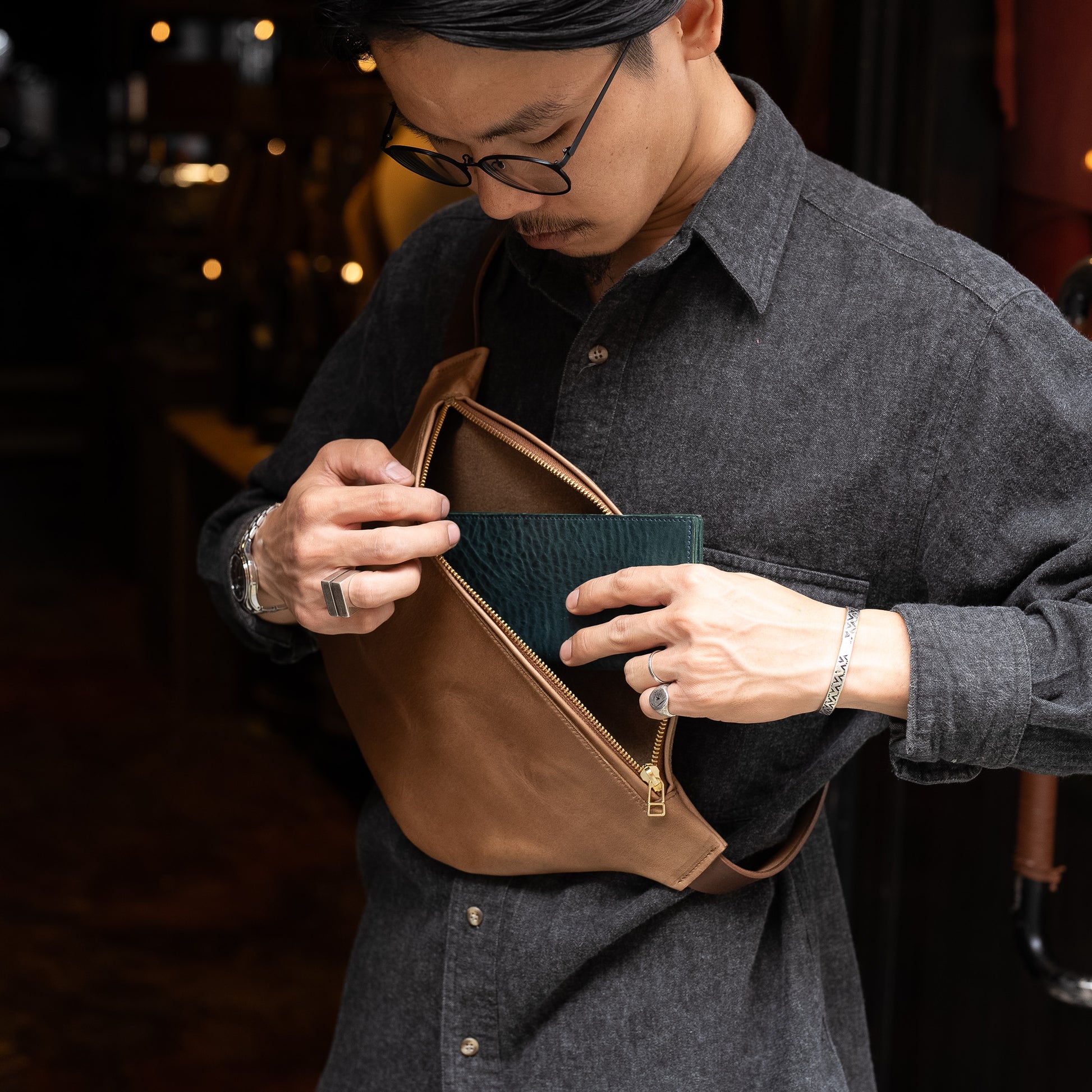 革の表面のみの染色(=下地染色をしていない)の”丘染め”なので、「茶芯レザー」としても認知されています。