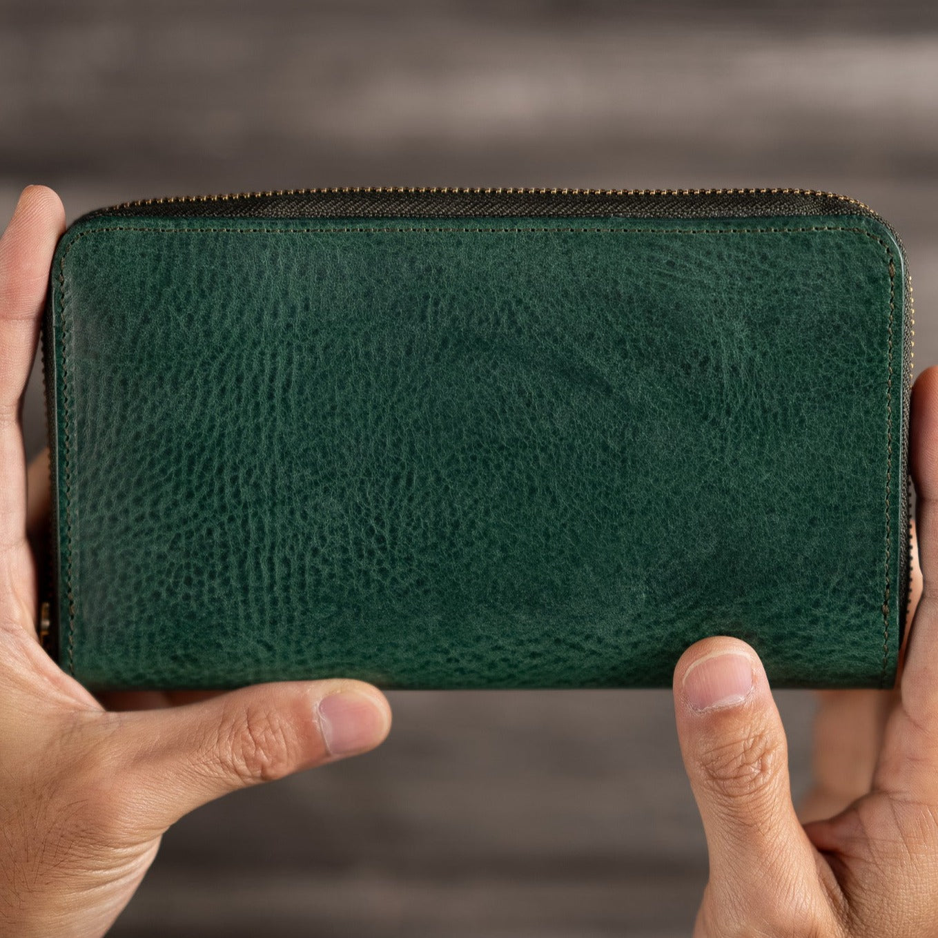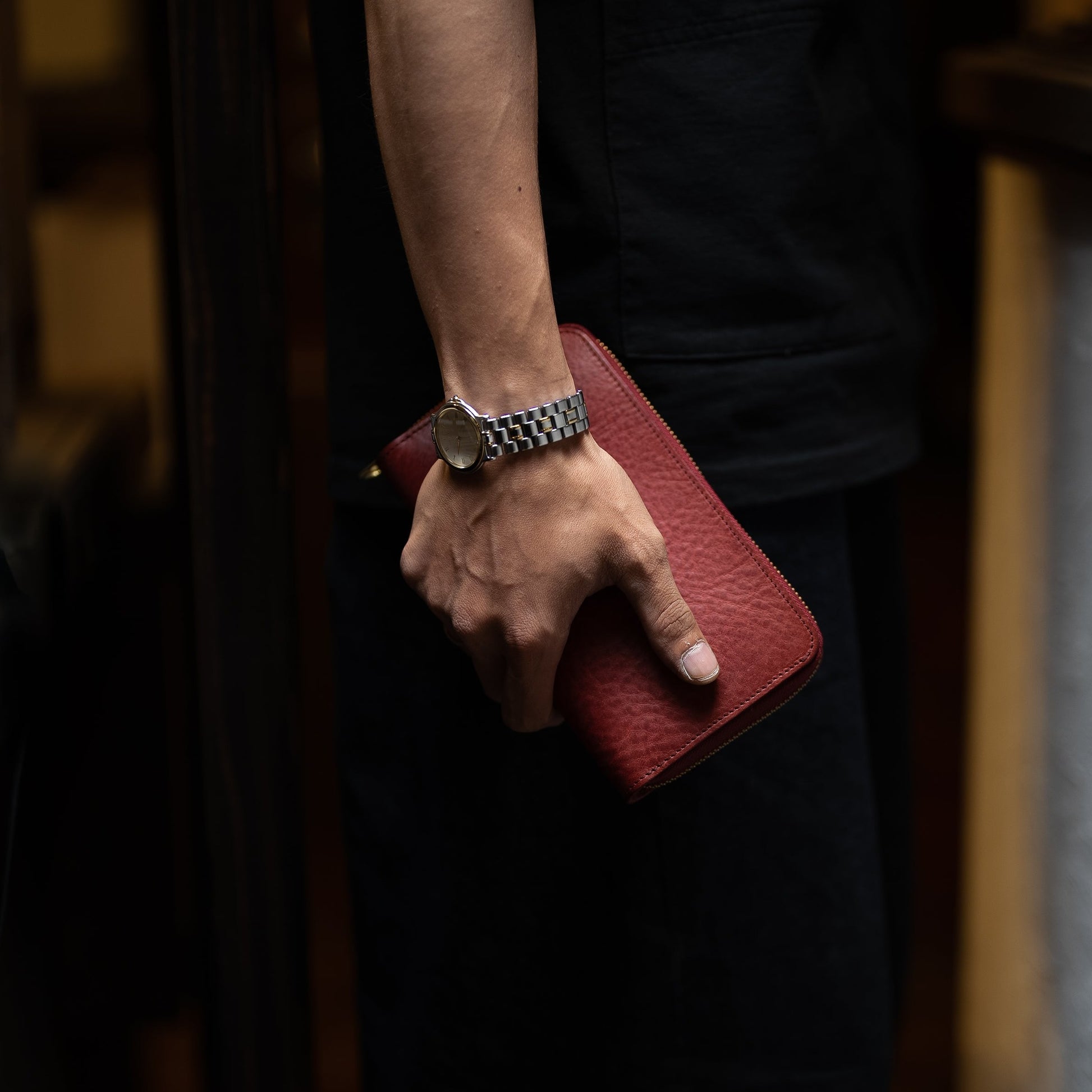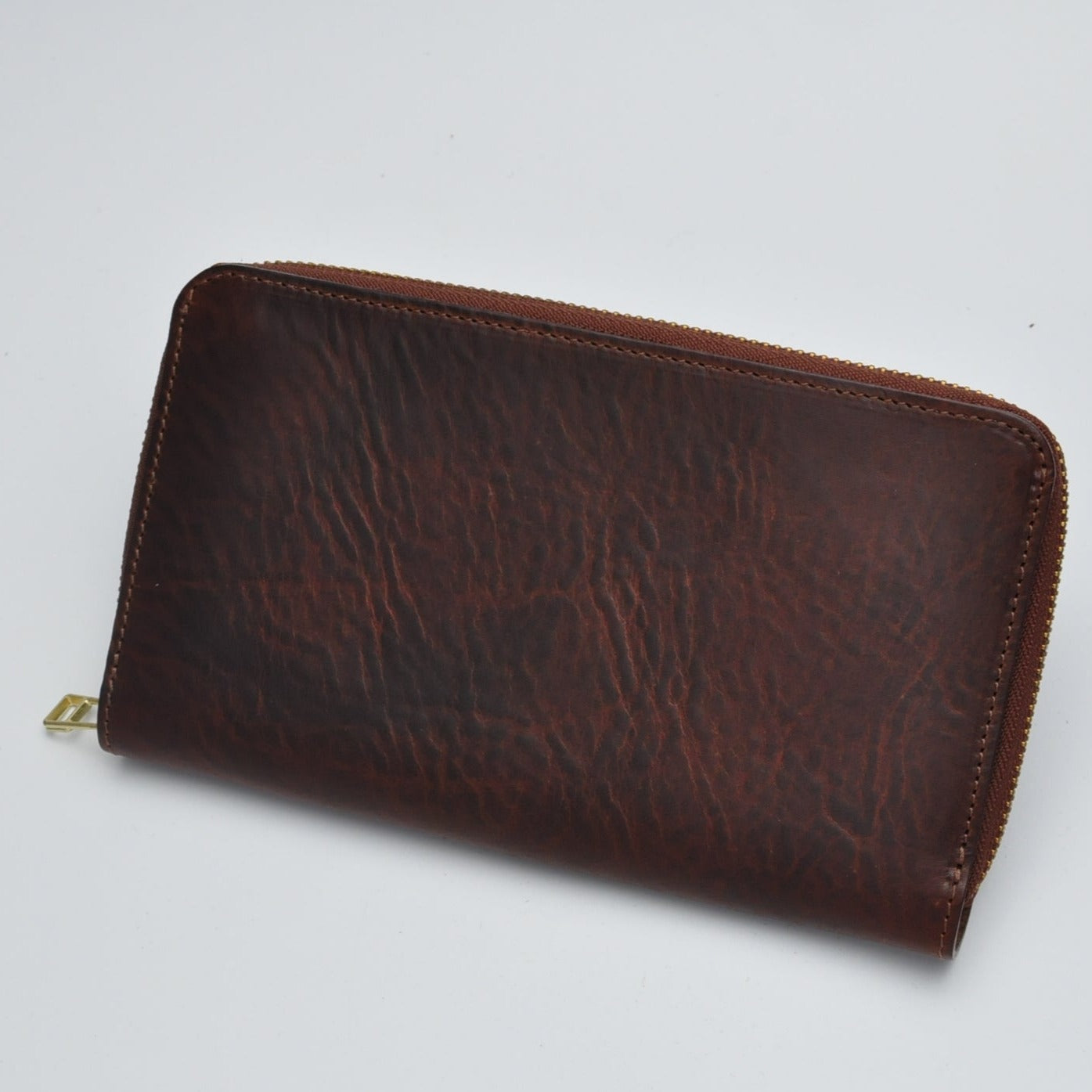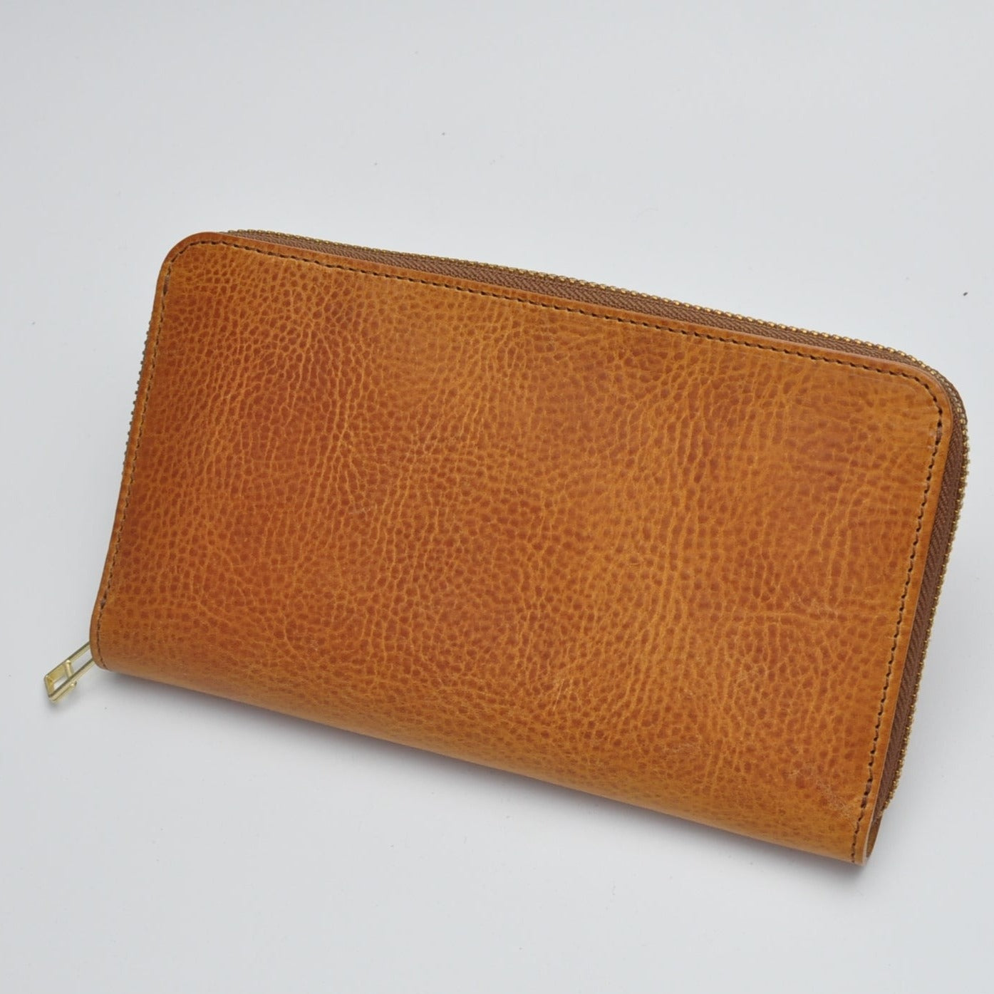 イタリアのサンタクローチェ地方で作られているアマゾニアという牛革を使用しています。植物タンニン鞣しで染料仕上げ、そしてバケッタ製法により油分がしっかり入った革なので、使い込むほどに味わい深い色に変化し、自然な艶が出てきます。経年変化を存分に楽しんでいただける革です。