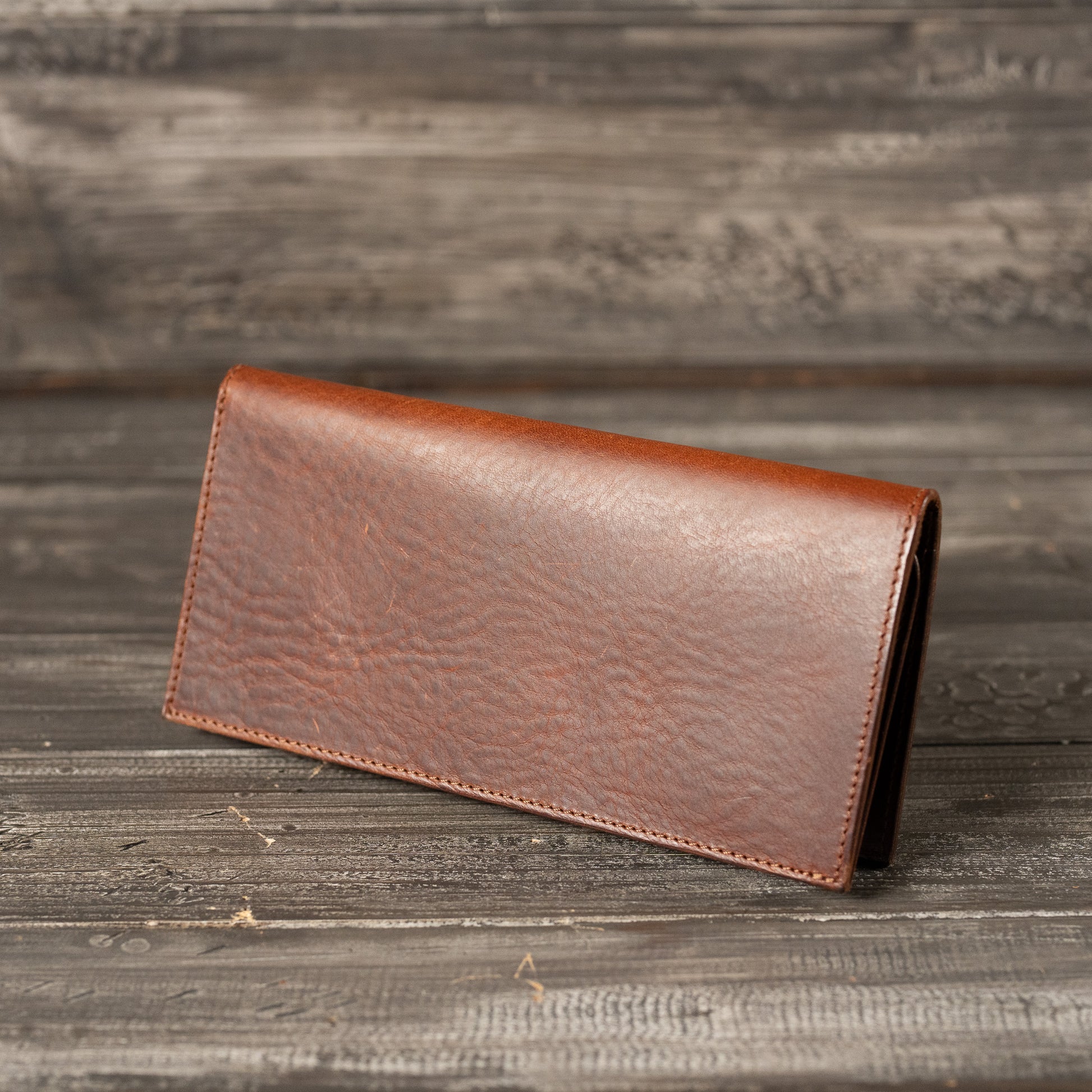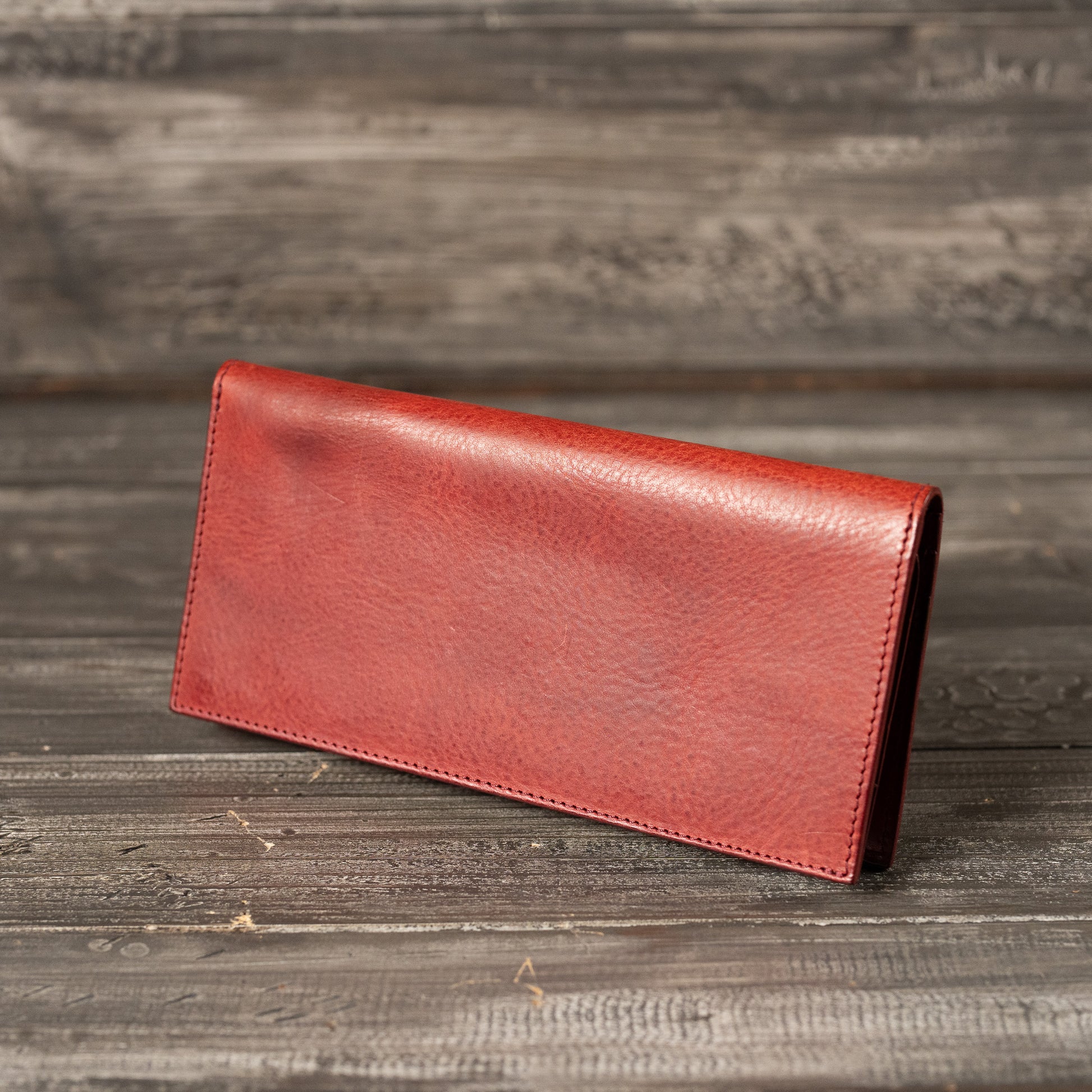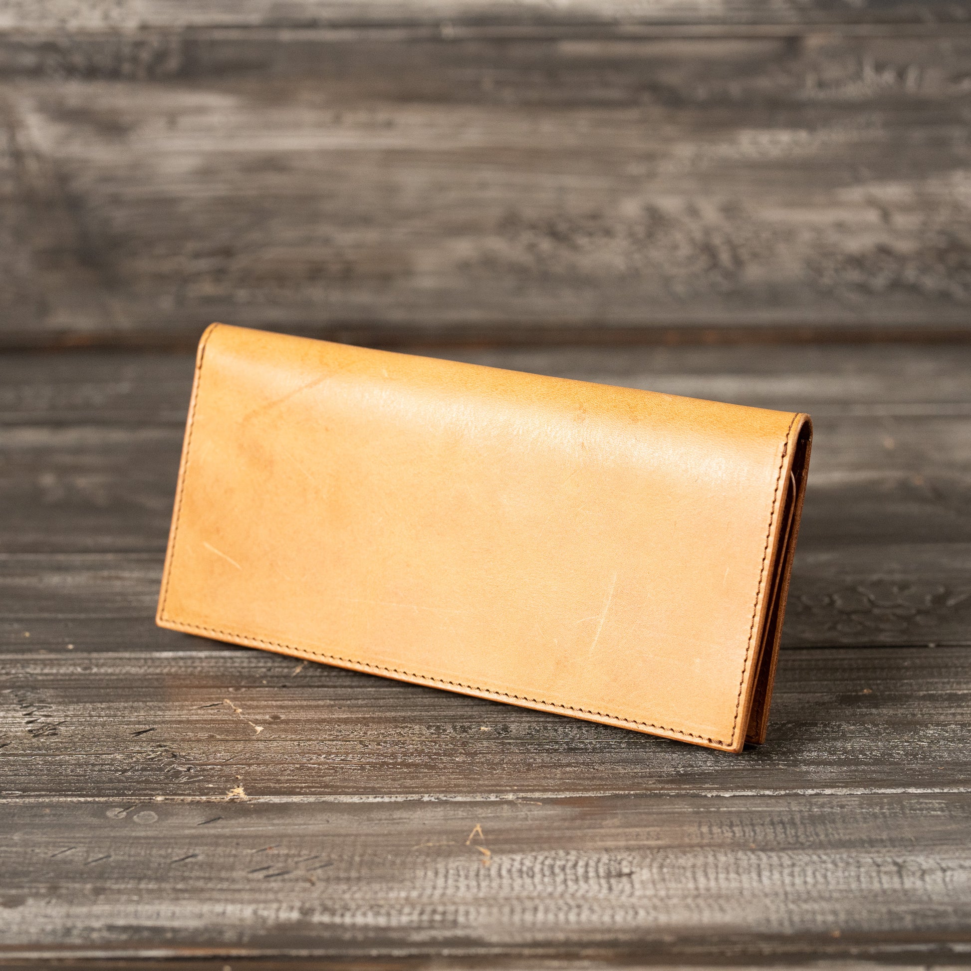 イタリアのサンタクローチェ地方で作られているアマゾニアという牛革を使用しています。植物タンニン鞣しで染料仕上げ、そしてバケッタ製法により油分がしっかり入った革なので、使い込むほどに味わい深い色に変化し、自然な艶が出てきます。経年変化を存分に楽しんでいただける革です。